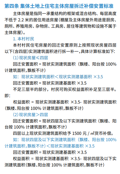 本村村民集体土地上住宅主体房屋拆迁补偿安置标准 本村村民住宅房屋的回迁安置原则上按照现状房屋四层以下(含四层)实测建筑面积进行拆一补一,具体计算标准如下:(1)现状房屋 ≤ 四层回迁安置面积 = 现状实测建筑面积(飘楼、阳台按 100%计建筑面积,飘板不计)如:现状实测建筑面积<现状实测建基面积 ×3.5回迁安置面积 = 现状实测建基面积 ×3.5不足三层半的部分,村民可购买权益面积补足至三层半。即:权益面积 = 现状实测建基面积 ×3.5- 现状实测建筑面积(飘楼、阳台按 100% 计建筑面积,飘板不计)(2)现状房屋>四层回迁安置面积 = 现状四层及以下实测建筑面积(飘楼、阳台按 100% 计建筑面积,飘板不计)四层以上现状实测建筑面积给予 1500 元 / ㎡货币补偿。如:现状四层及以下实测建筑面积(飘楼、阳台按 100%计建筑面积,飘板不计)<现状实测建基面积 ×3.5回迁安置面积 = 现状实测建基面积 ×3.5权益面积 = 现状实测建基面积 ×3.5- 现状四层及以下实测建筑面积(飘楼、阳台按 100% 计建筑面积,飘板不计)