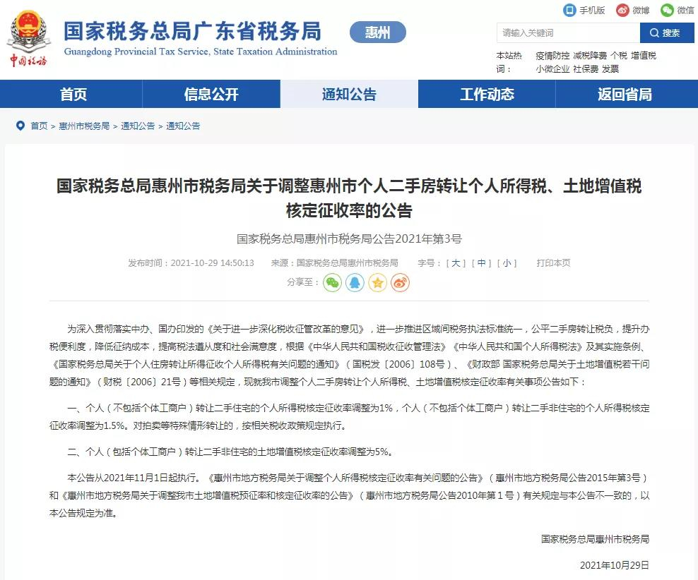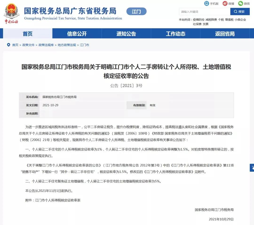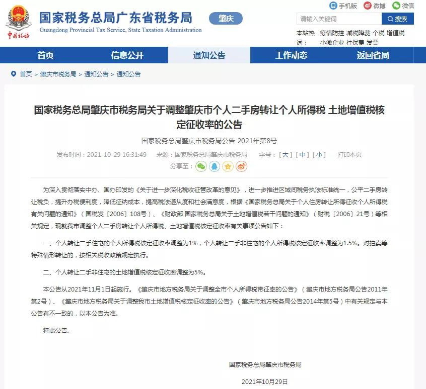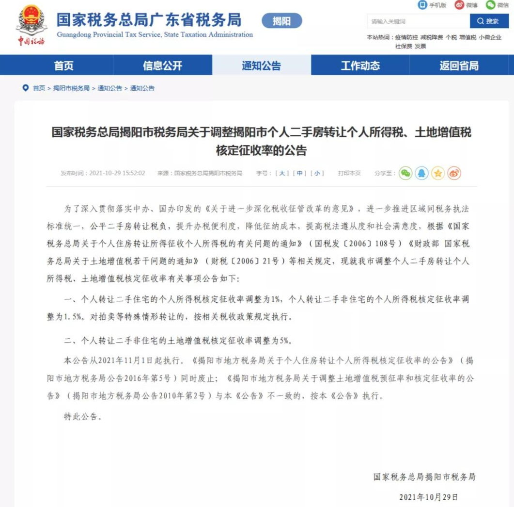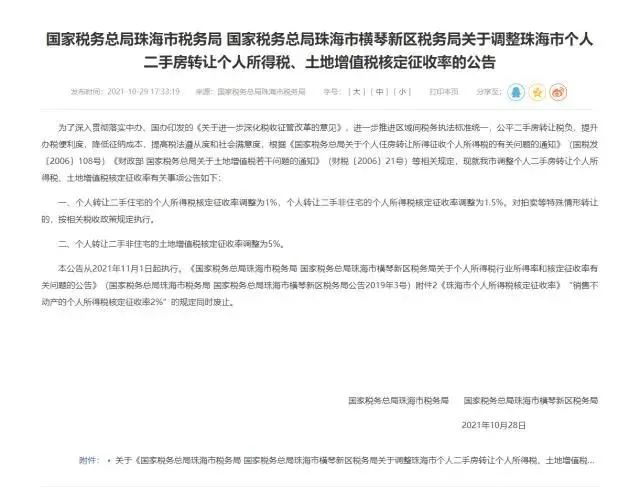 10月29日,珠海市税务局、肇庆市税务局、江门市税务局、惠州市税务局、揭阳市税务局官宣,11月1日起,正式降低二手房交易个税。