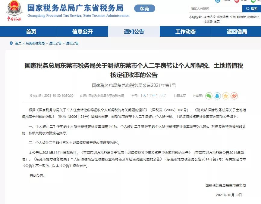 10月30日,国家税务总局东莞市税务局发布公告称:11月1日起,东莞正式降低二手房交易个税!