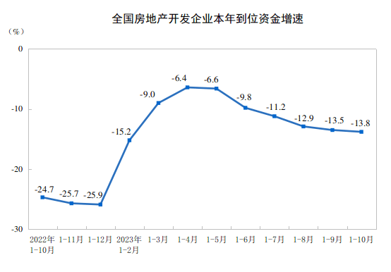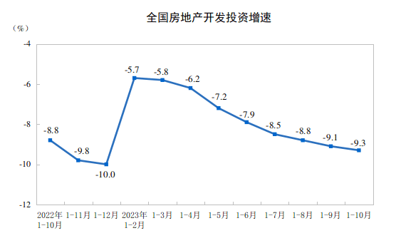 国家统计局数据显示,1-10月份,全国房地产开发投资95922亿元,同比下降9.3%(按可比口径计算),降幅比1-9月份继续扩大0.2个百分点;其中,住宅投资72799亿元,下降8.8%。