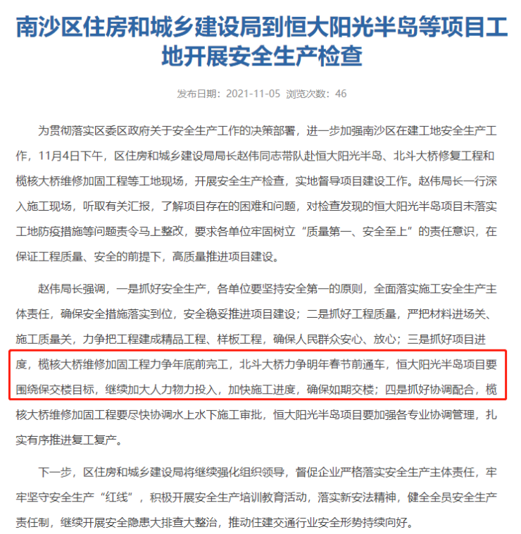 近日,广州市南沙区住房和城乡建设局(广州市南沙区交通运输局)发布了《南沙区住房和城乡建设局到恒大阳光半岛等项目工地开展安全生产检查》报告。