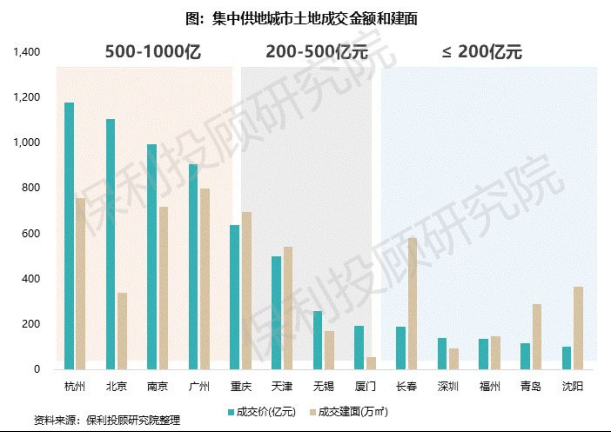 据保利投顾研究院监测,杭州、北京首轮揽金均过千亿,分别以1178亿元、1102亿元出让金规模位居一二。