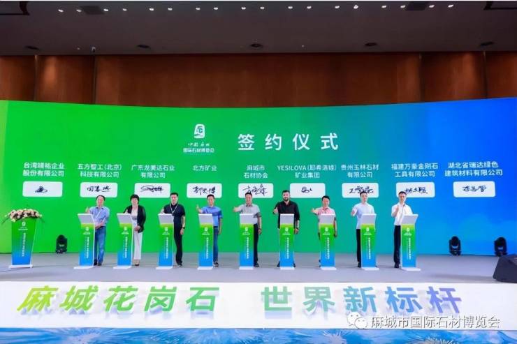 麻城市石材协会常务副会长李恒章、土耳其耶希洛娃矿业集团总经理吉米Cemil Çelik,台湾靖祐企业股份有限公司总经理黄威源,北方矿业集团执行董事郭天博,贵州省石材协会会长,贵州玉林石材有限公司董事长王登亮,云浮石材行业协会常务副会长、广东龙美达石业有限公司董事长龚美华,湖北省瑞达绿色建筑材料有限公司总经理李昌营,福建万豪金刚石工具有限公司总经理林文段,五方智工(北京)科技有限公司营销总监司素燕上台进行签约,麻城国际石材博览会全球发布启动仪式在激昂的氛围中完满圆成!