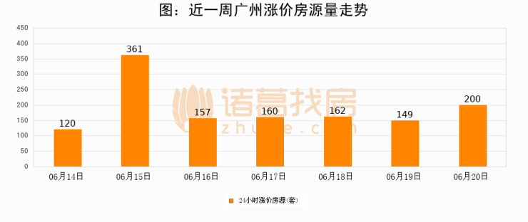 根据诸葛找房数据显示,广州24小时涨价房源量为200套,较06月19日增加51套,环比上涨34.2%。与此同时,涨价房源占比小幅扩大,业主信心有所提升。