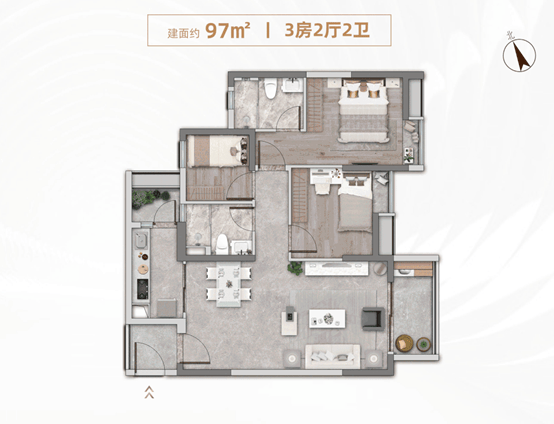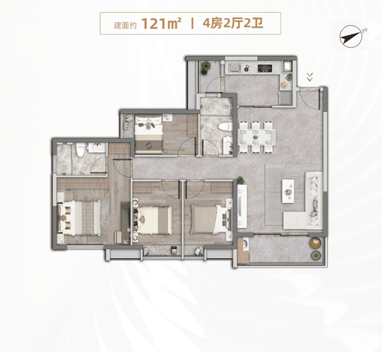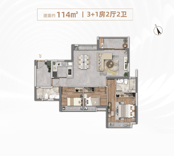 把镜头移向约114㎡户型,它同样做到全开间朝阳、全卧室朝南。室内进行了“去走廊”的设计,每个空间都能做到完全的通风采光,不受阻挡,而且卧室皆为南向。