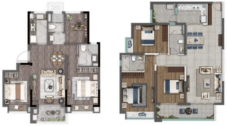 我整理了目前主城区有三房在售的项目,常见户型布局都如下图所示,至少有一个卧室朝北:
