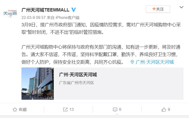 2022年3月9日,接广州市政府部门通知,因疫情防控需求,需对广州天河城购物中心采取“暂时封闭,不进不出”的临时管控措施。