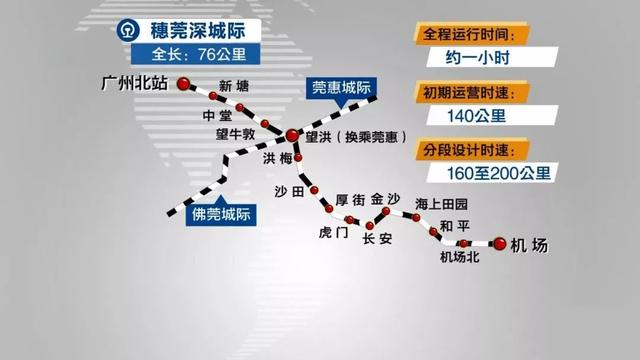 穗莞深城际铁路起点为广州北站,终点为深圳机场站,全长约76公里,全线共设15个车站,全程运行时间1小时,成为沟通广州、东莞、深圳三市的快速交通通道。