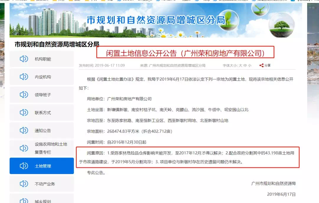 根据公开信息,2019年6月17日,增城区政府官网挂出了一份闲置土地信息公开公告,其用地单位正是广州荣和房地产有限公司。