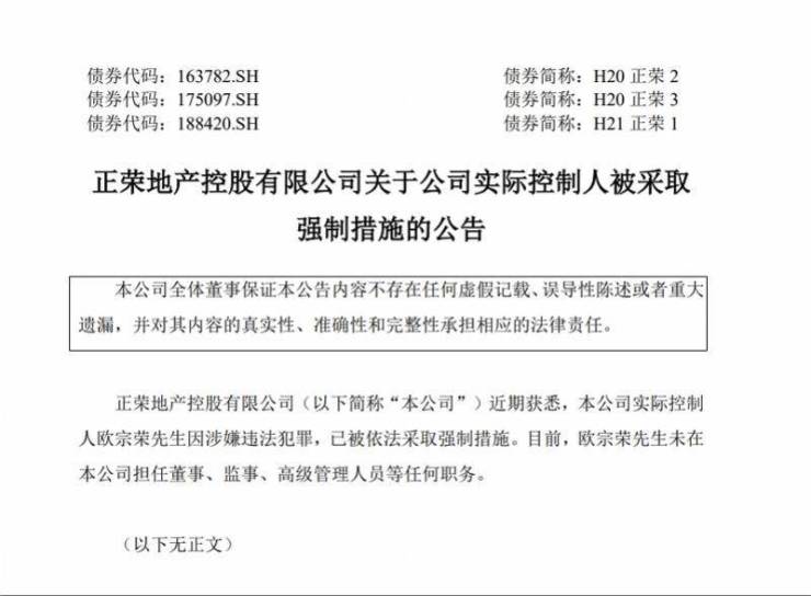 1月20日,正荣地产控股有限公司发布公告,近期获悉,公司实际控制人欧宗荣因涉嫌违法犯罪,已被依法采取强制措施。目前,欧宗荣未在公司担任董事、监事、高级管理人员等任何职务。