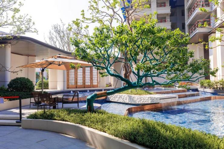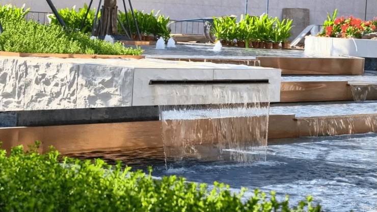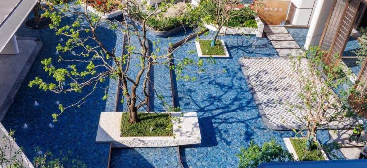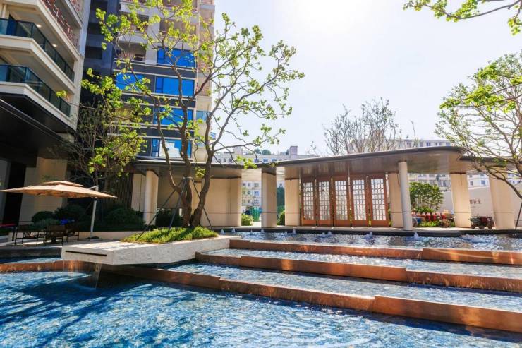 作为归家的起点,「水月芳屿」静雅会客厅,以水景为核心,借鉴岭南名园“余荫山房”,入口处金属屏风纹样取自经典海棠纹,体现了“岭南园林入社区”的理念。水景间设置“汀步”,衔接叠水与主景,形成“园中有园”的层次感。