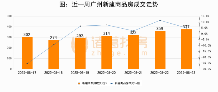 根据广州市住房和城乡建设局数据显示,2025年08月23日广州新建商品房成交377套,较昨日增加18套,环比上涨5%
