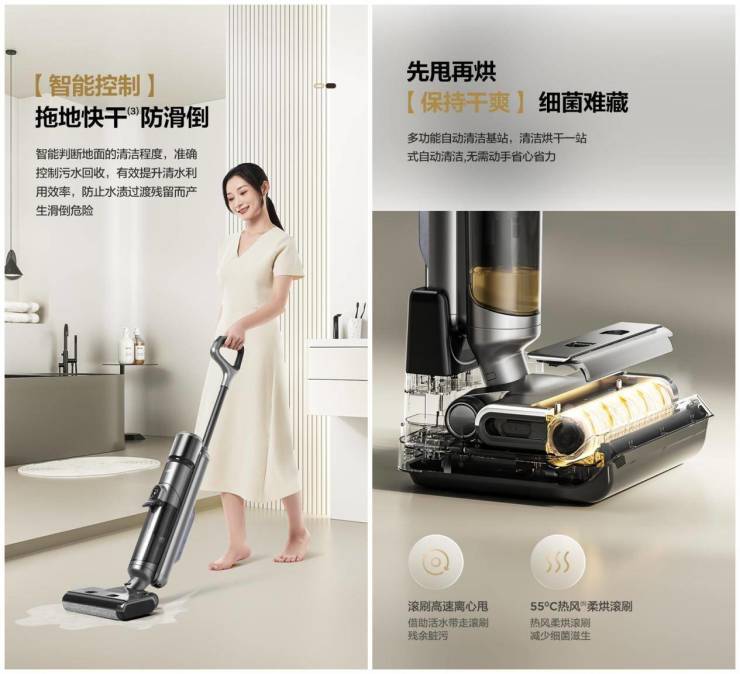 另外,南方城市即将进入梅雨季节,这个时候湿拖布不易晾干,很容易滋生细菌,导致居室二次污染。苏泊尔洗地机M02H除了高速离心甩,借助活水带走滚刷残余脏污以外,还通过55°热风柔烘滚刷,彻底让滚刷干燥,减少细菌滋生。