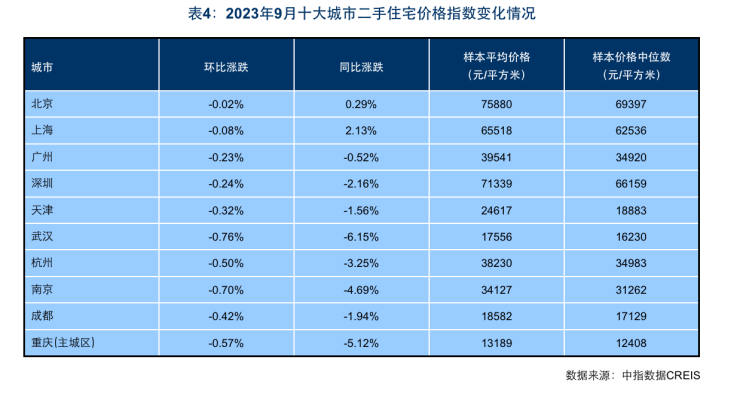 根据《百城价格指数报告》,9月,全国100个城市新建住宅平均价格为16184元/平方米,环比由跌转涨,涨幅为0.05%;同比跌幅收窄至0.10%。百城二手住宅平均价格为15556元/平方米,环比下跌0.44%,跌幅较8月扩大0.06个百分点,已连续17个月环比下跌;同比跌幅扩大至2.59%。