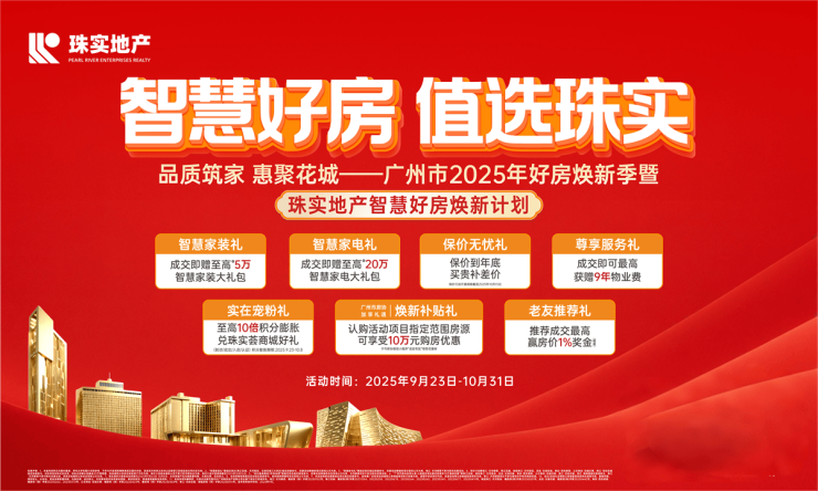 值此金九银十黄金季,为让更多市民得以畅享智慧好房带来的品质生活,珠实地产响应广州市2025年好房焕新季活动,特别推出珠实地产智慧好房焕新计划。有智“慧”、更有智“惠”的超级6+1礼遇诚意满满。指定项目指定户型成交即赠至高约5万元智慧家装、至高约20万元的智慧家电礼包;承诺保价至年底,买贵补差价(保价行动开展周期截至2025年10月15日),免除客户后顾之忧;成交最高可获赠9年物业费;友邻推荐成交最高可赢取房价1%的奖金(税前);活动期间,珠实荟会员积分更可至高膨胀10倍(积分膨胀期限截至2025年10月8日)。此外,广州市房地产行业协会亦重磅加享礼遇,认购指定项目房源可享受10万元购房优惠。多重利好叠加,无疑为智慧安家提供了绝佳契机。