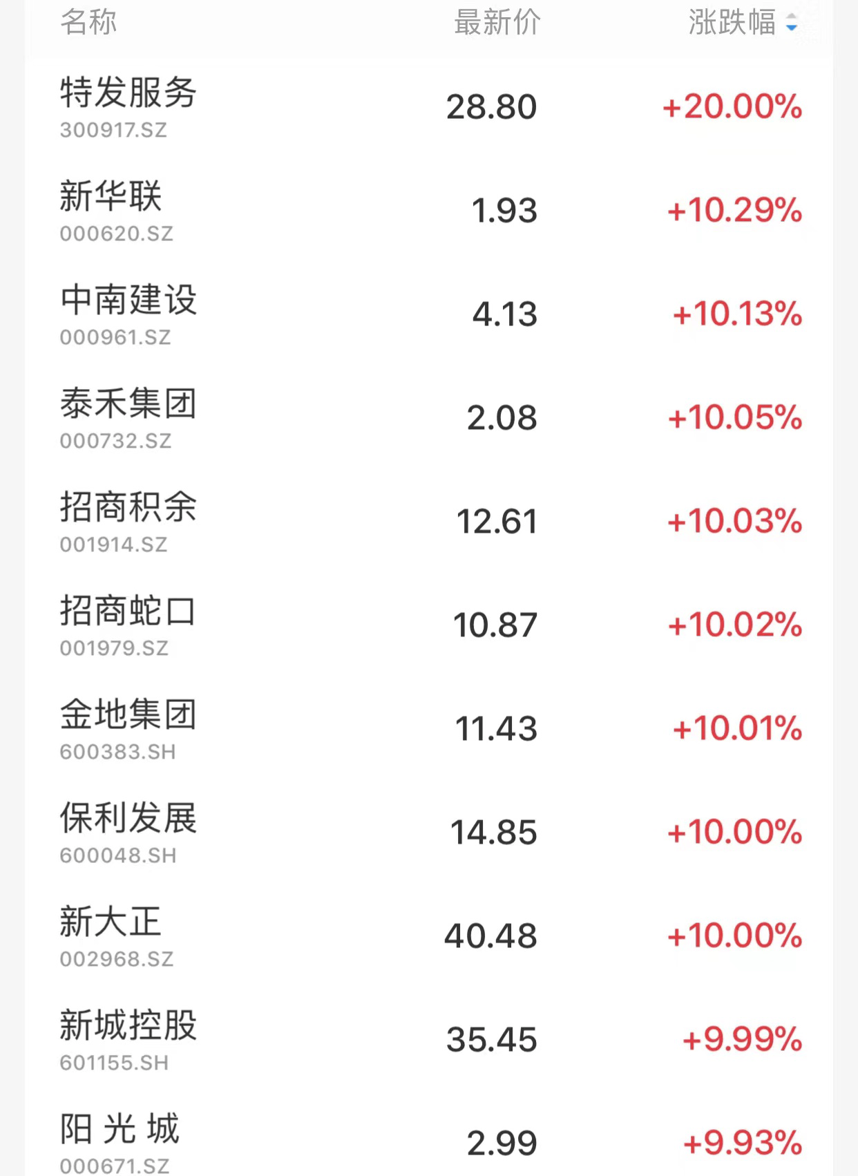 新华联、中南建设、泰禾集团、保利发展、招商蛇口、金地集团等多股涨停,涨幅超10%。此外,阳光城涨9.93%,万科A涨9.54%,金科股份涨7.8%等,涨幅也较高。地产股全线爆发,也带动家居、家电、水泥、建材、钢铁等产业链大涨。