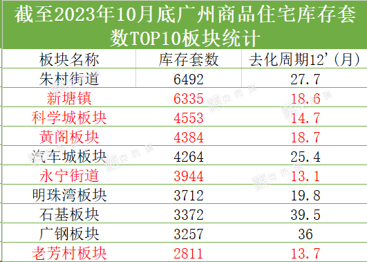 例如新塘板块、科学城板块、黄阁板块、永宁板块、以及老芳村板块,它们去化周期之所以低于全市平均水平,共同原因之一就是它们都是所在区域成交相对活跃的板块,流速快,去化周期自然低于全市平均水平。