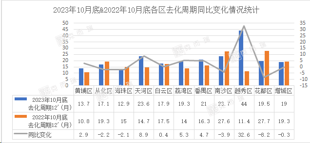 同比方面,克而瑞数据监测显示,截至今年10月底,全市11区去化周期同比去年减少的区域有5个,其中花都区是去化周期同比去年减少最多的区域,去化周期较去年减少了8.2个月。