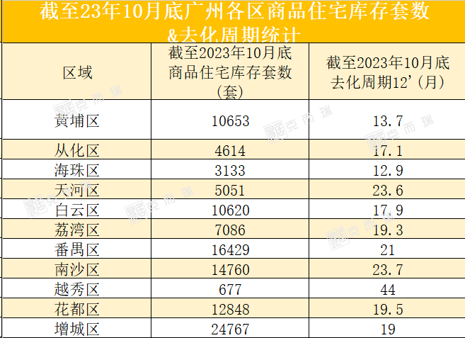 具体到各区来看,数据监测显示,截至今年10月底广州各区商品住宅库存去化周期低于全市水平的区域只有从化、黄埔、白云、海珠5区,其余6区去化周期均高于全市水平。