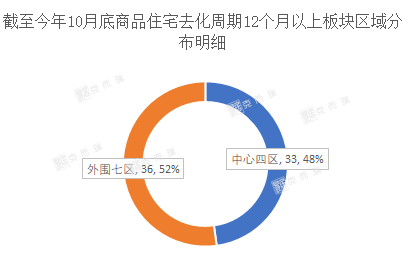 在去化周期在12个月以上的69个板块里,中心四区板块的数量占比接近一半,基本与外围区持平。