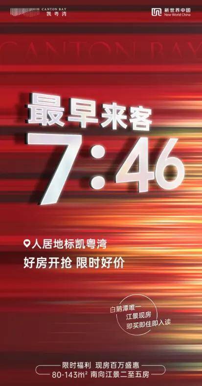 同在荔湾白鹅潭的新世界凯粤湾,特别推出【江岸现房节】购房重磅福利,看房热度高涨。作为白鹅潭人气大社区,项目在假期第一天早上七点多就迎来第一批客户,随后还多次出现凌晨仍在成交、礼炮不断的场面,热销不打烊。