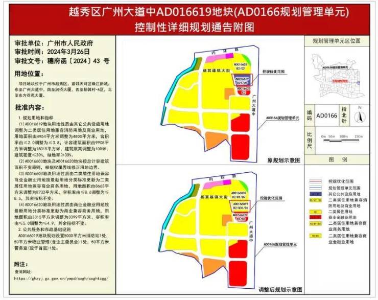 今年8月初,广州规划自然资源局发布了地块相关控规调整。地块用途由原来的办公用地调整为二类居住兼容商业、商务办公用地,限高由120米增加到150米,容积率也由原来的4.5降至3.7,建筑限高由120米调整为150米,绿地率保持35%不变。