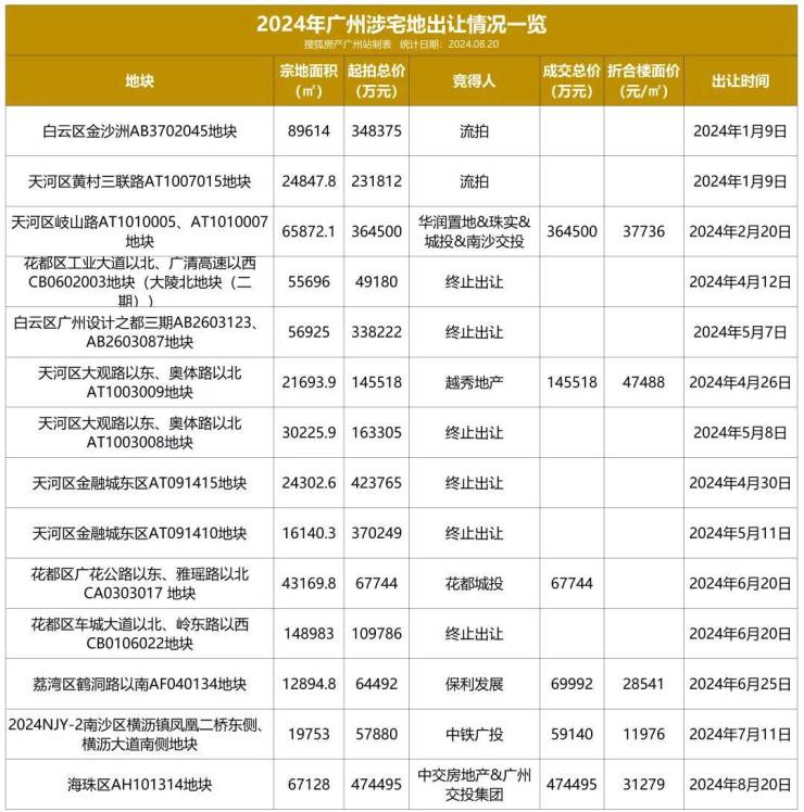 截至8月21日,广州已有12宗涉宅地摆上货架,拟于8月23日-9月24日期间分批出让。