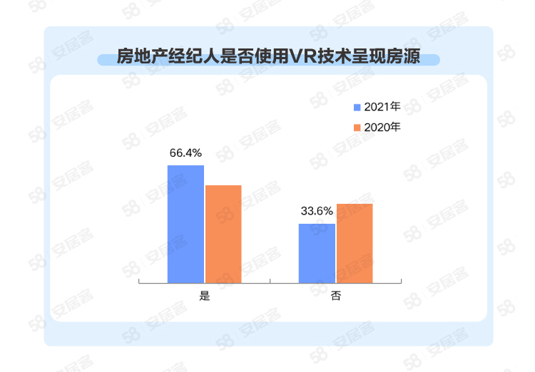 值得关注的是,2020年受客观原因影响,房地产经纪人每日最主要的工作正在向线上化转变。房地产经纪线上化趋势下,更多高效的科技产品正在被逐渐应用。数据显示,逾六成房源使用了VR呈现,比去年提高了11%,一线城市VR房源占比超过70%。客户通过VR看房及线上微聊占比较往年增长,作业效率提高,经纪人电话约看和带客看房比例有所降低,科技产品在行业渗透率增加。
