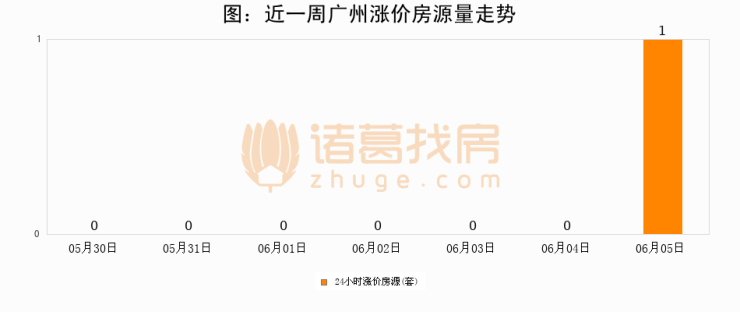 根据诸葛找房数据显示,广州24小时涨价房源量为1套,较06月04日增加1套,环比上涨0%。与此同时,涨价房源占比小幅扩大,业主信心有所提升。