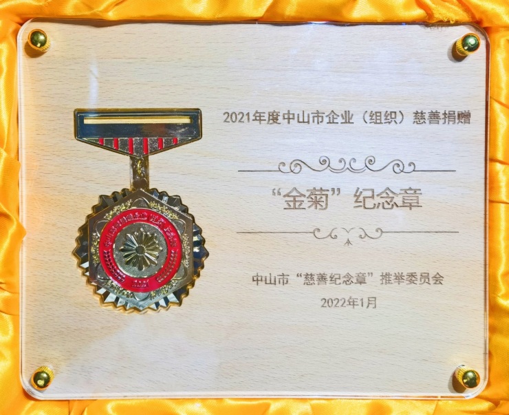 ▲敏捷集团荣获2021年度中山市企业(组织)慈善捐赠“金菊”纪念章