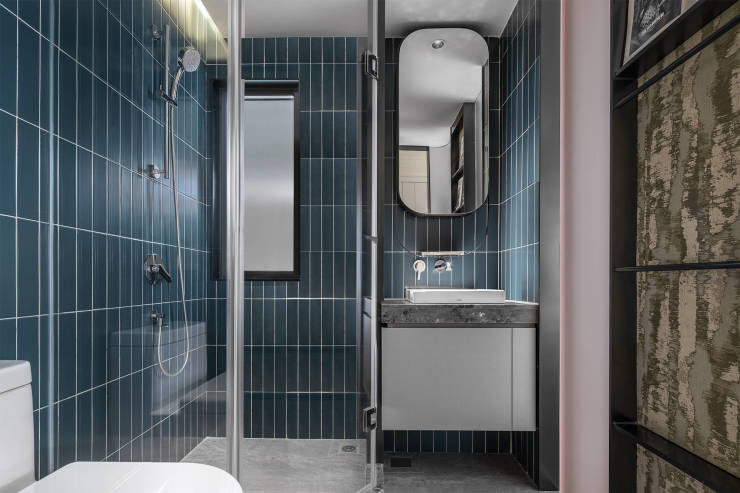 全屋大面积采用的铝合金钢化LOW-E中空玻璃;在卫生间,台盆转角采用弧线处理,门框底部容易接触水,特地换成石材包底,交标还配备了智能魔镜和智能马桶。