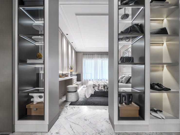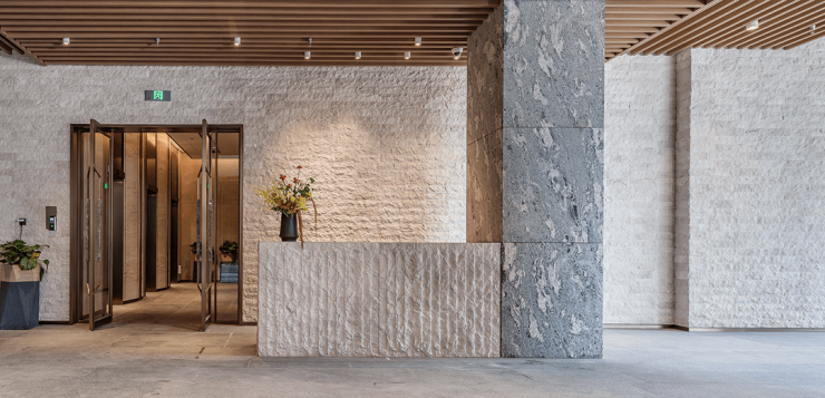 三大堂的设计,有着天然的征服力。首层大堂,净高更是达到惊人的12米,仿佛误入六星级瑰丽酒店,石材与木饰的元素交错,让回家充满仪式感。二层大堂,也有约3.6米高,木格栅引景入室,而浅灰色波浪纹花岗石,透露着工艺质感。