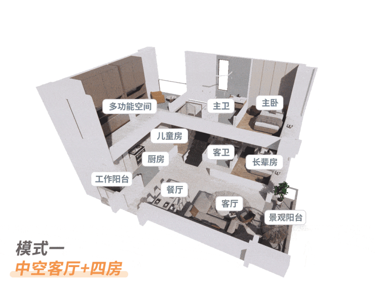 它还有一大特别,便是生活扩展性。一方面,你可以打造中空客厅,近乎全面屏采光,这种墅居体验是平层无法实现的。同时亦有四房空间,实现对不同作息的完整包容。