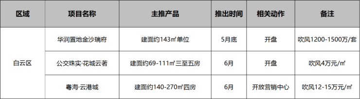 各板块“内卷”激烈的白云区6月共推出3个项目,包括华润置地金沙瑞府、粤海·云港城以及公交珠实·花城云著,楼价丰俭由人 。