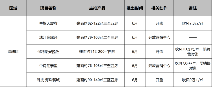 具体来看,6月带来的多为“新鲜货”,如珠江广钢花城、振业天成、粤海·云港城、先进晴翠府......