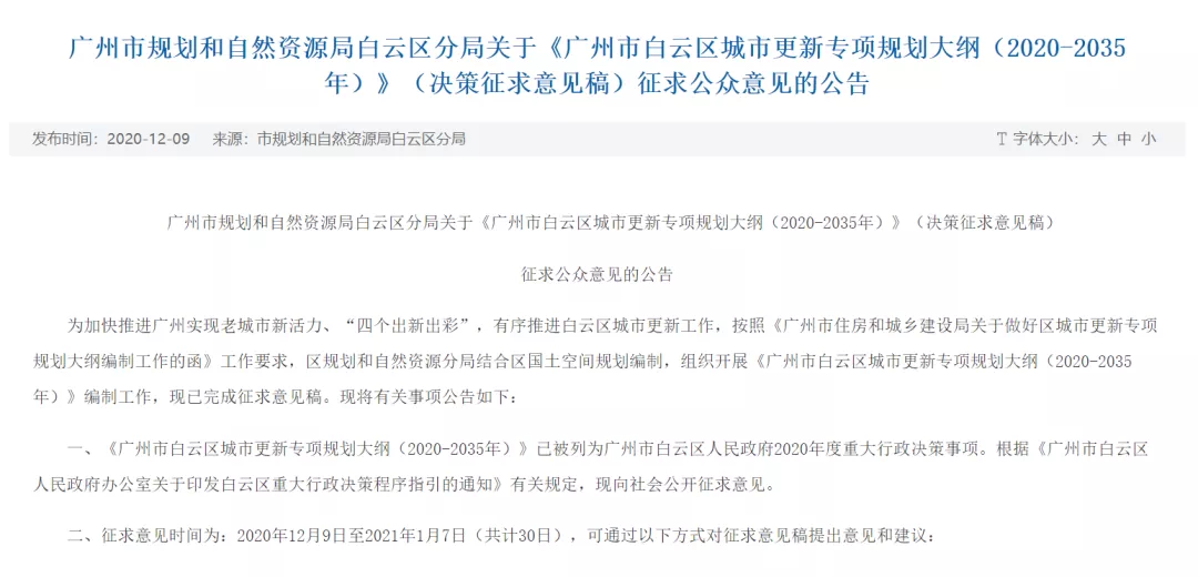 近日,广州市规划和自然资源局白云区分局关于《广州市白云区城市更新专项规划大纲(2020-2035年)》(决策征求意见稿)征求公众意见的公告。继区发展峰会和土地推介会后,白云区加紧步伐,发布其城市更新专项大纲,足以见识到白云区整体区位发展提升的强烈决心。