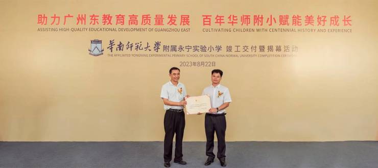 图注:华南师范大学附属小学党总支书记、校长张锦庭为华南师范大学附属永宁实验小学校长黄钟信先生颁发聘书。