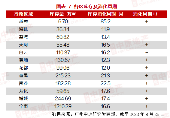 依广州中原发展研究部统计数据显示,由于今年6-8月成交量出现明显下滑,去化能力减弱,导致广州一手住宅库存消化周期“抬头”,目前已逼近17个月水平,处于年内高位。