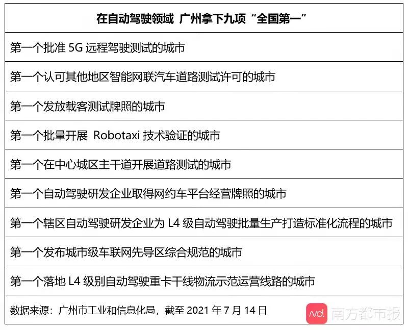 早在2020年8月,广州便发布了《关于开展智能网联汽车道路测试先行试点工作的通知》,随后几个月,就向文远知行等企业颁发了远程测试许可证,属于国内排名前列批;2021年3月,广州批准黄埔区、南沙区率先开展先行试点区建设;2021年7月,批准花都区开展先行试点区建设……
