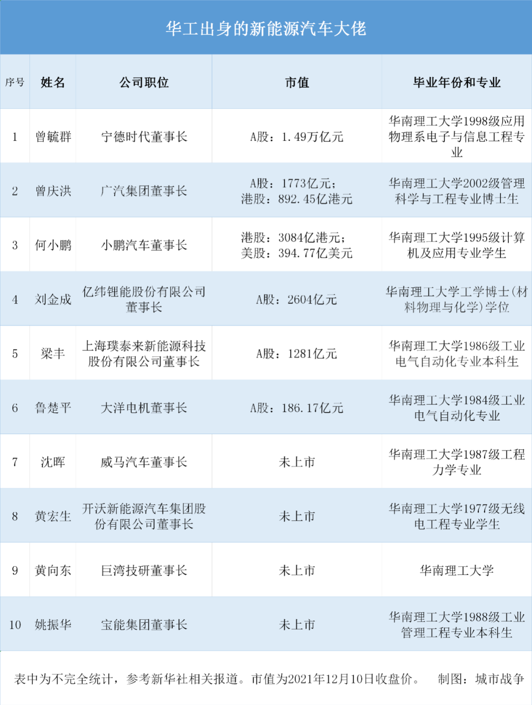 通过下面这张表格,大家感受一下华南理工大学校友在中国新能源汽车圈的“统治力”👇