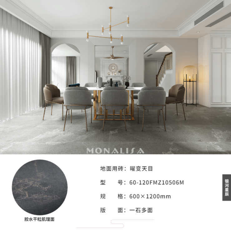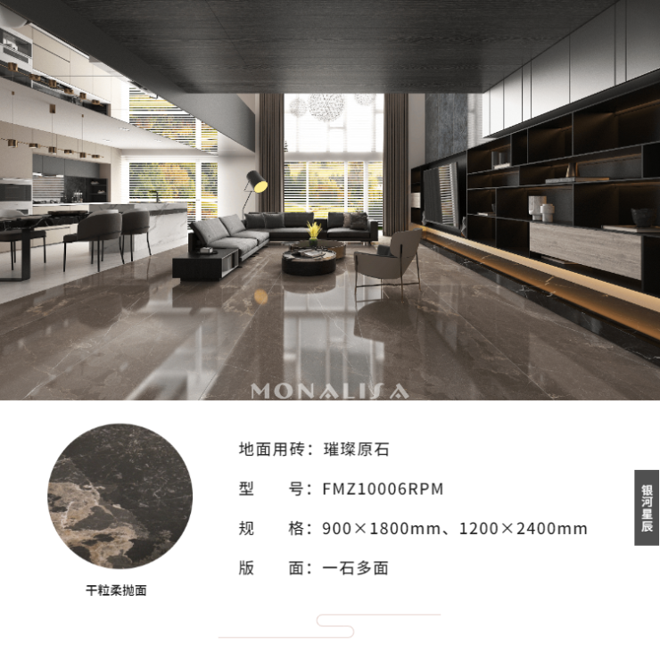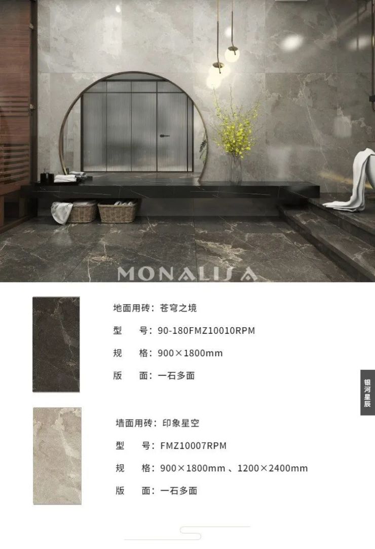 银河星辰系列拥有1200×2400(mm)、900×1800(mm)、600×1200(mm)三种规格,为大、中、小户型以及不同应用区域设计匹配的规格,让意大利原创设计产品走进千家万户。