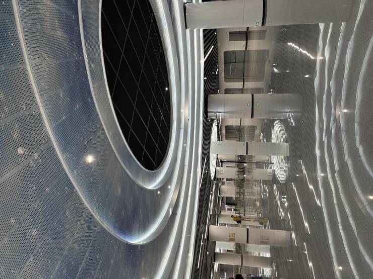 天河公园站为三线换乘车站,是广州地铁线网的重要交汇点,其中十一号线与二十一号线已开通运营。十三号线二期天河公园站全长约280米,标准段宽约34米,深约27米,为地下三层结构,沿用“浩瀚天际,天河星雨”的主题概念,打造兼具艺术性与功能性的地铁空间。在整体空间布局上,设计采用规整的几何形式,构建出以灰色为主的空间基调,并融入线性灯带,勾勒出光影线条。同时,以星空图案冲孔铝板为主题元素,搭配层叠错落的天花造型,与点状星光形成虚实映衬,营造出浩瀚星空的璀璨意境。