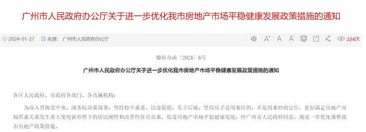 据广州市人民政府网站消息,1月27日,广州市人民政府办公厅关于进一步优化房地产市场平稳健康发展政策措施的通知,通知指出,①在限购区域范围内,购买建筑面积120平方米以上(不含120平方米)住房,不纳入限购范围。②在限购区域范围内,居民家庭将自有住房用作租赁住房并办理房屋租赁登记备案手续的,或者在我市存量房交易系统取得房源信息编码并挂牌计划出售的,购买住房时相应核减家庭住房套数。③对于具备合并不动产权证书条件的房屋,购房人可以申请转移登记业务、合并登记业务一同办理。④商服类物业不再限定转让对象。通知自2024年1月27日起正式实施。