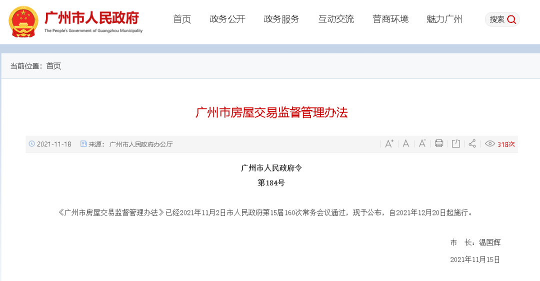 11月18日,广州市人民政府发布了《广州市房屋交易监督管理办法》,进一步加强房屋交易监督管理,规范交易行为。