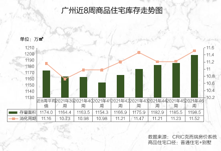 据统计,广州一手住宅库存已连续6个月上涨,截至11月21日,商品住宅库存面积为1198.5万㎡,消化周期延长为11.52个月。