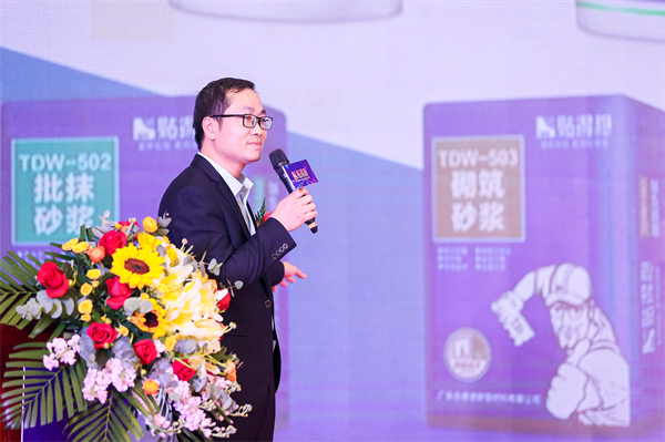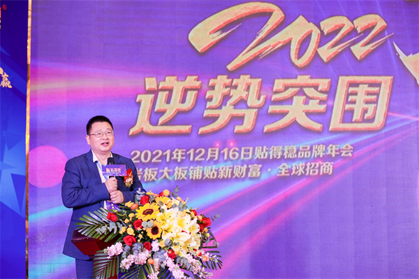 贴得稳品牌创始人董事长兼品牌总经理在致辞中表示:在过去的一年中,“贴得稳”在经济环境不确定、疫情反复、原材料大幅上涨、多时段限电、市场竞争激烈的多重不利影响下,依然实现了35%-50%的月销售额递增率。能在同行业中取得这样骄人的成绩,离不开“贴得稳团队小伙伴们”的自身努力,更离不开在座的各界领导及上下游的合作伙伴的厚爱和支持。粘贴行业乱象丛生,市场形势严峻,产品良莠不齐,施工应用没有统一标准,这些问题在品牌推广过程中造成了巨大困扰,同时也对粘贴材料以及应用技术提出了更高的要求。因此高品质的饰面材料更需要高标准的材料、更科学的施工工艺、更优秀的铺贴师傅、更专业的施工工具来保障咱们的家装市场的铺贴安全。贴得稳是一个有责任,有担当,有理想的细分市场先进品牌,贴得稳将脚踏实地,努力践行为中国低碳人居环境贡献一份力量!