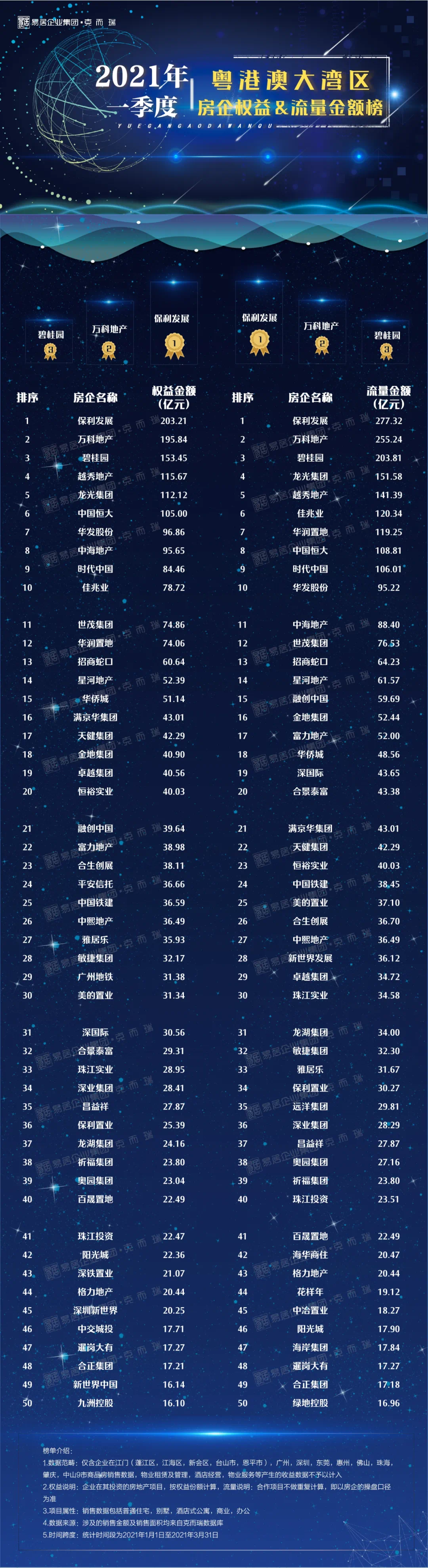 龙头房企之中,保利发展斩获一季度湾区权益金额(203.21亿)、流量金额(277.32亿)双榜冠军;