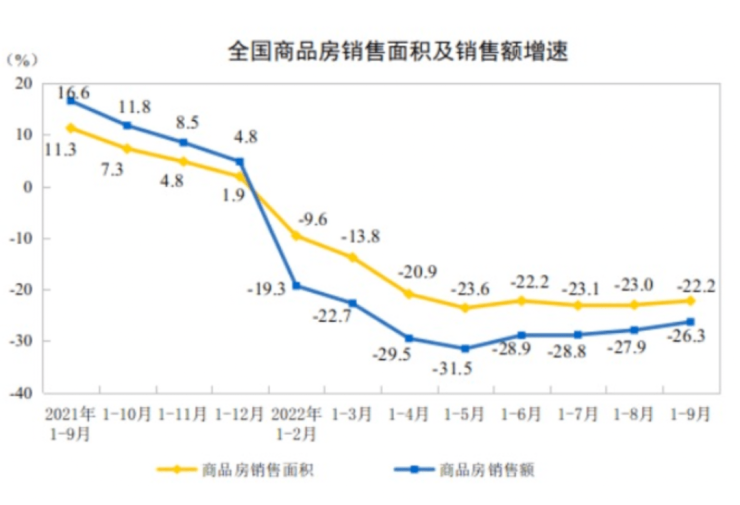 截至9月末的,全国商品房(新房)销售额同比下降了26.3%,销售面积同比下降了22.2%。