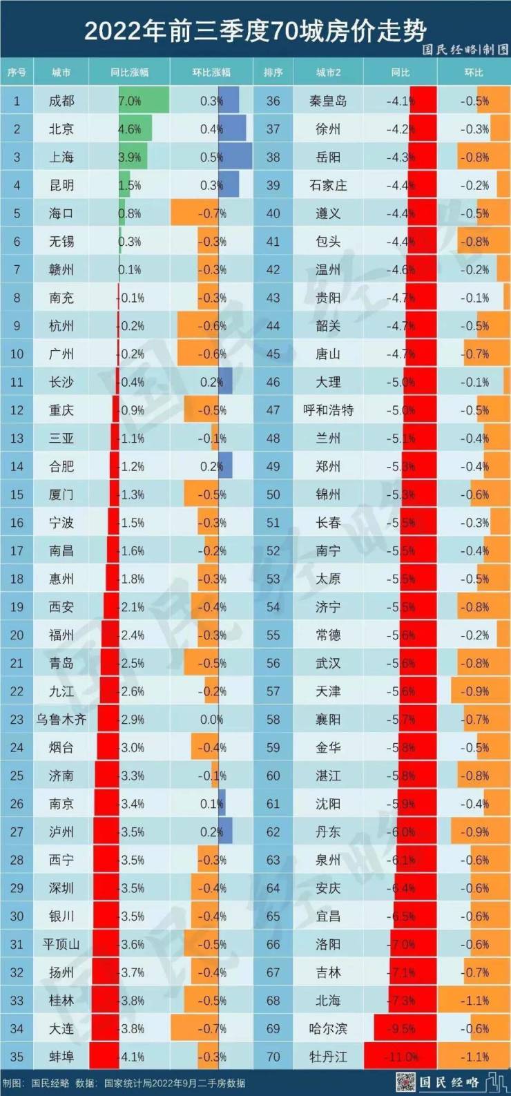 从2022年前三季度来看,在70个大中城市中,只有7个城市同比涨幅为正,63个城市房价低于一年前。