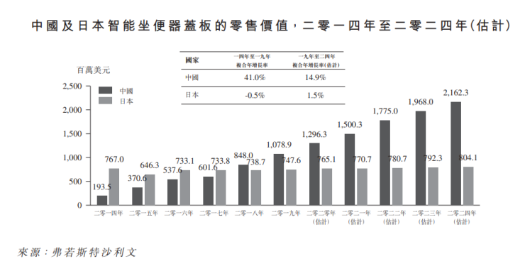 据此前公布的招股说明书,科利实业此次港股上市募集的资金主要用于以下方面:进一步在全球个人护理及生活时尚电器行业增加据点及扩大市场份额,包括扩张及升级公司的生产设施以提升生产能力、提升公司的产品设计及工程能力、增加于销售及营销职能的投资以及升级公司的信息科技系统及设计辅助软件。科利实业表示,正计划以自有品牌“iHA”,明年在中国市场推出拥有五项专利,附设供暖、自动清洁、烘干、除臭、消毒和照明功能的智能马桶盖。该公司还计划委聘一家市场推广公司为品牌建设设立计划,为智能马桶盖产品建立和执行营销模式。此外,科利实业引述数据指,智能马桶在中国及日本的零售价值预期将于2024年增至21.62亿美元,其中中国市场2019年至2024年的复合年增长率预计达到14.9%。
